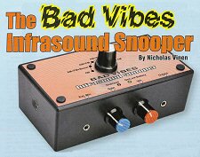 Back in March 2014 we published the Infrasound Detector for low frequency measurements. Now you can ‘listen’ to low frequency vibrations using this Infrasound Snooper. It frequency-shifts and amplitude-modulates by about five or six octaves a frequency range of about 1Hz to 20Hz, so you can actually detect and ‘listen’ directly to low-frequency sound created by wind turbines, generator equipment or even animals such as crocodiles and elephants.